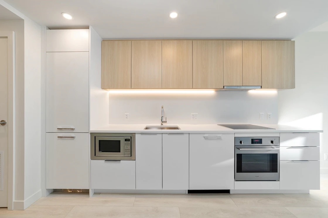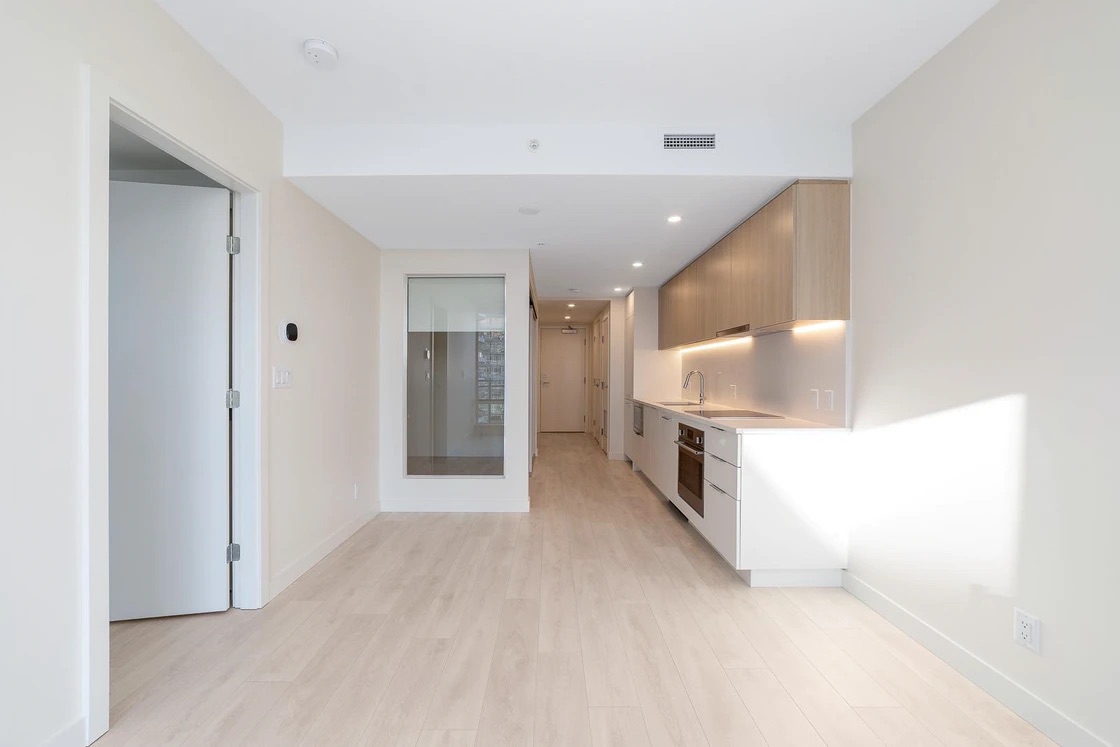 The living space is finished with wide-plank laminate flooring in warm grey tones, creating a clean and modern feel throughout. The sleek kitchen is equipped with quartz countertops and backsplash, offering both style and durability.