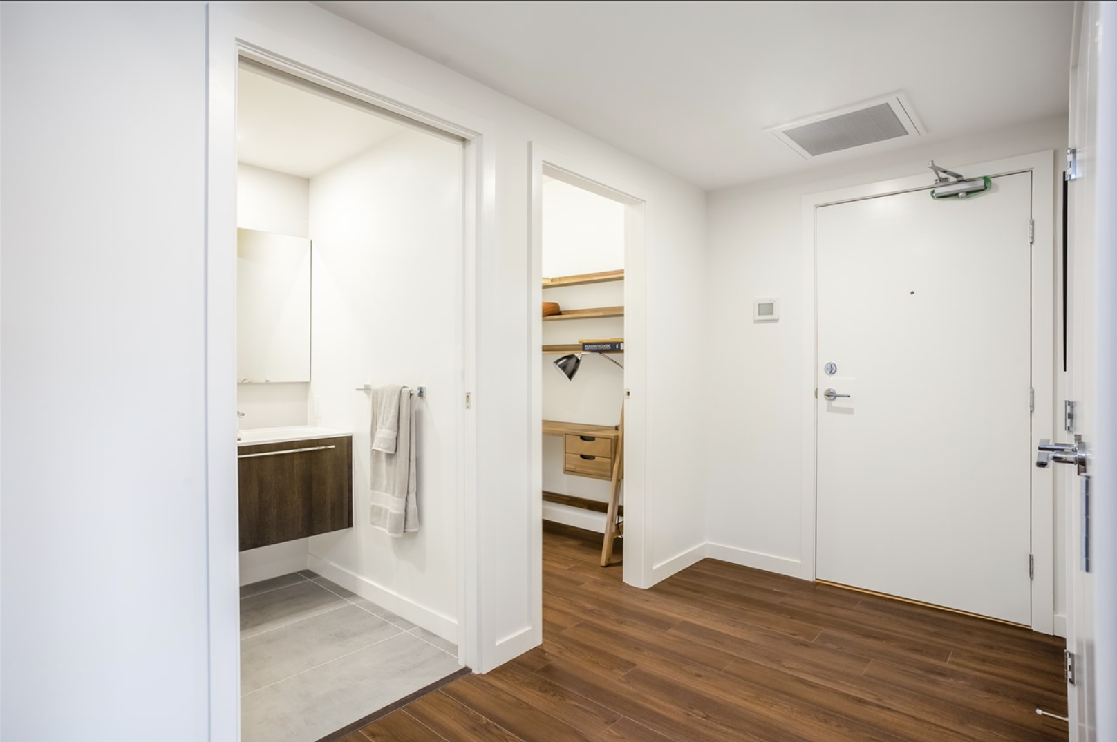 The suite features a sunny south-facing exposure, filling the home with natural light throughout the day. Its smart, efficient layout makes excellent use of every square foot, while modular closet systems add impressive storage. For year-round comfort, enjoy the luxury of built-in cooling/AC—a rare and valuable perk in Vancouver rentals.