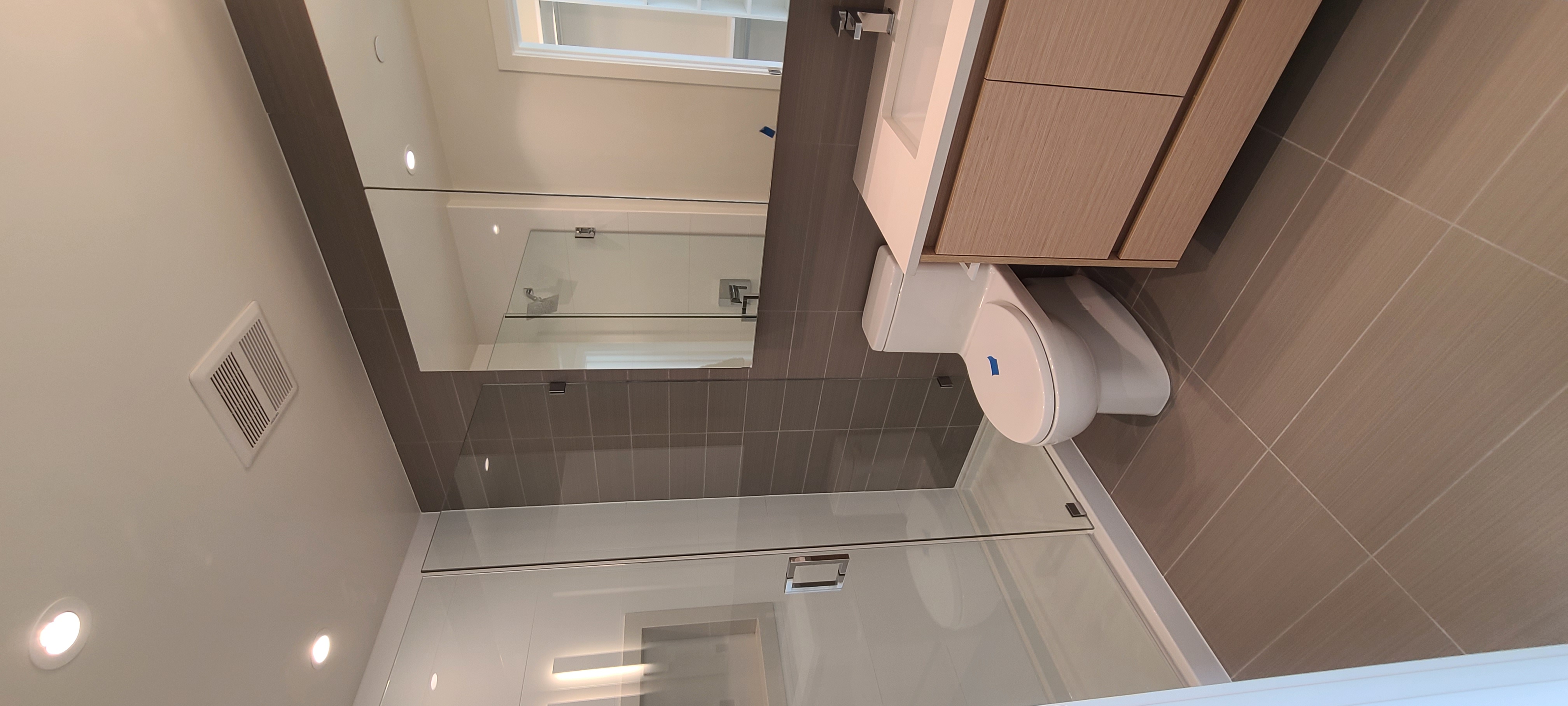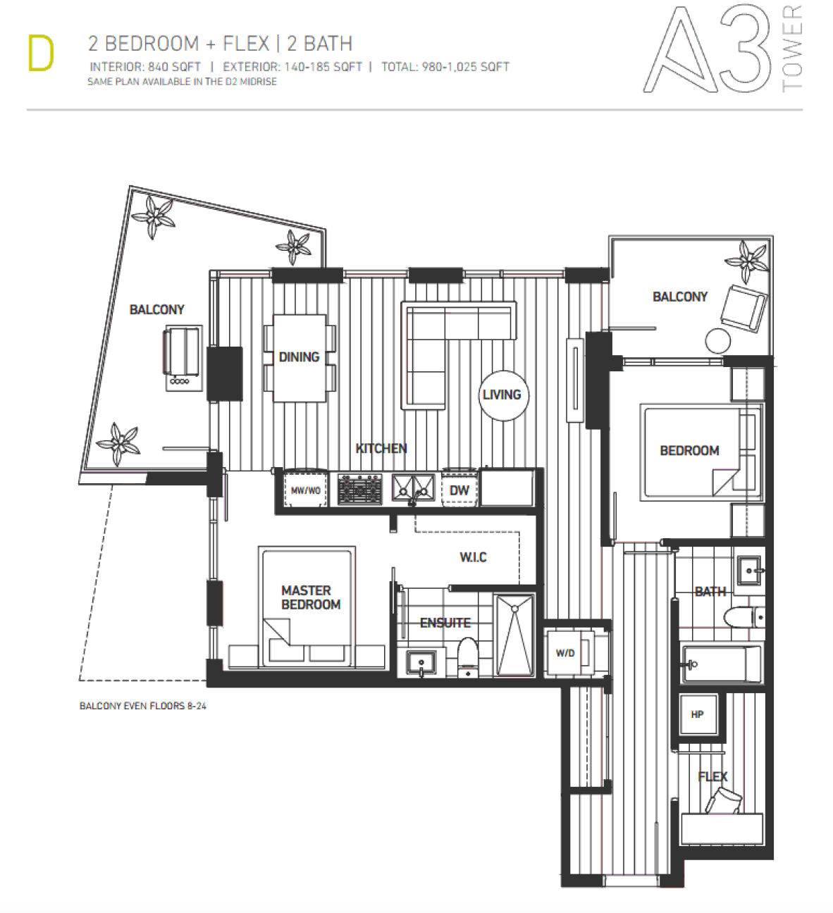 The beautiful master bedroom features a walk in closet with an elegant spa-inspired ensuite bathroom. The second bedroom features a storage solutions and a semi-ensuite bathroom. The flex is perfect either as a small home office space or in-suite storage. In-suite laundry.