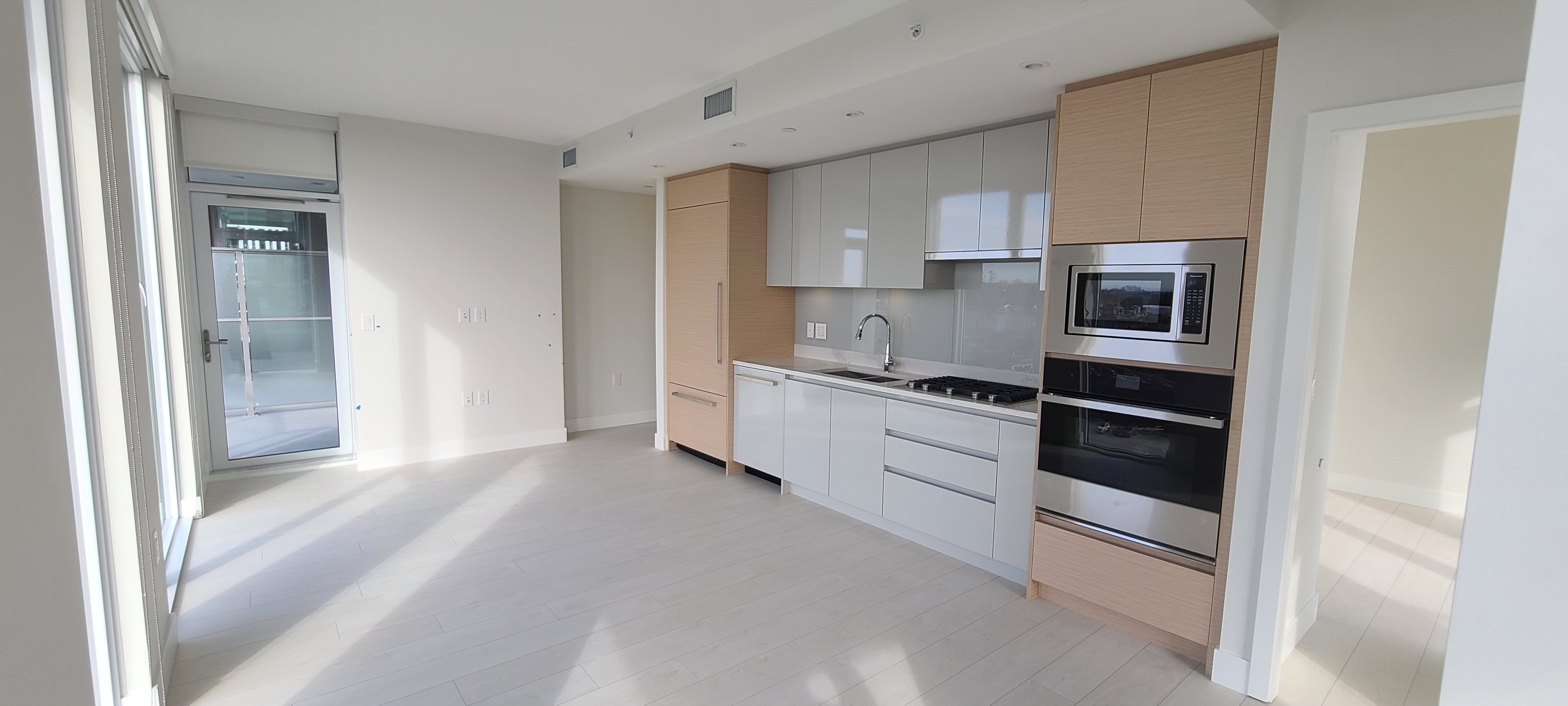 In the open concept living area you find the contemporary gourmet chef's kitchen featuring premium appliances, sleek quartz countertops and soft-closing doors and drawers. From the living area you access both balconies and with floor to ceiling windows you have plenty of natural light and a view overlooking the river.